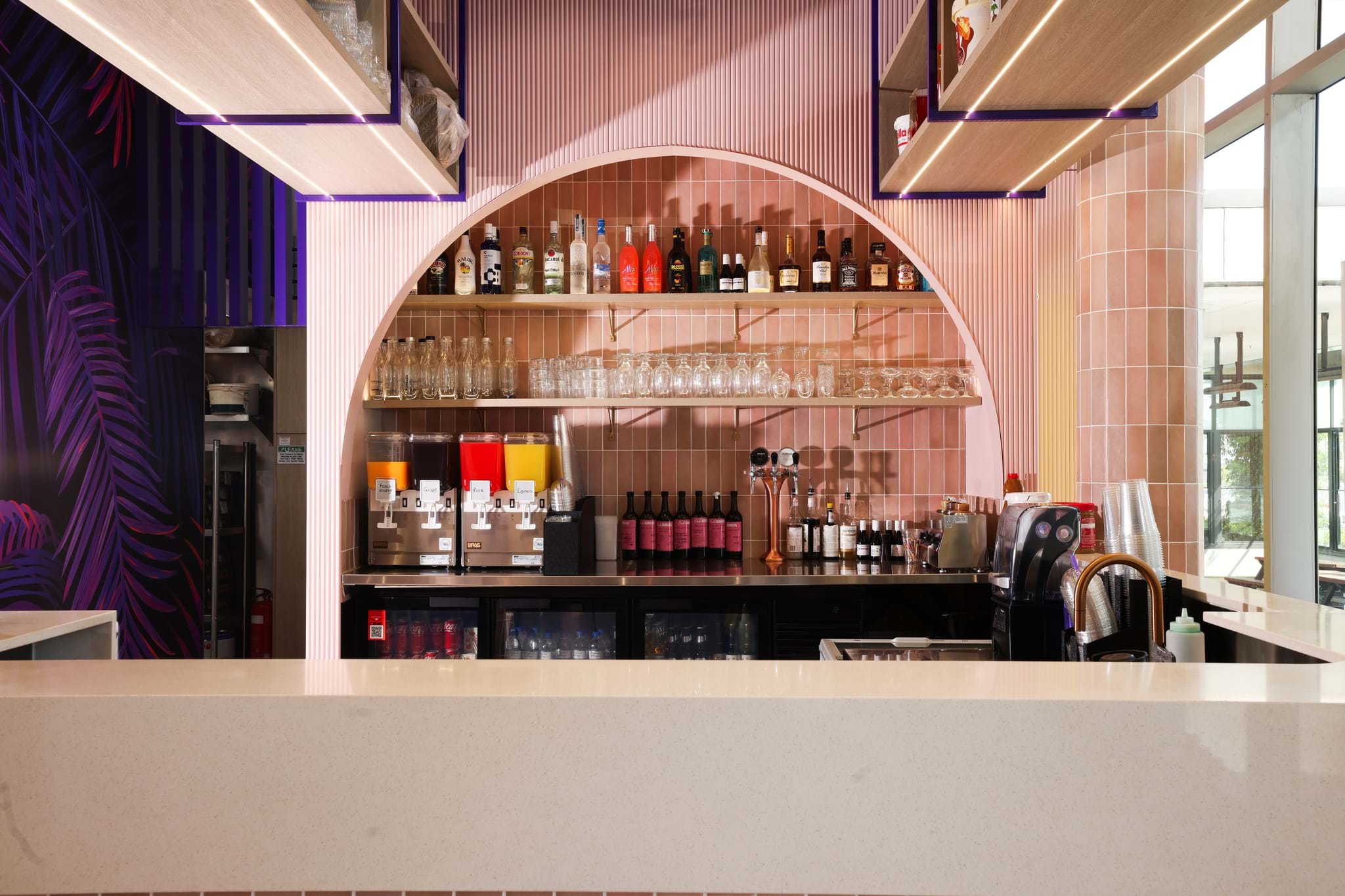 Just around the corner, Cali Burgers presented a very different design challenge. This high-energy hospitality venue required a standout feature that would match the vibrancy of its atmosphere while maintaining a refined, designer finish. The concept was bold, dynamic, and a little unconventional—an opportunity to push the aesthetics of our panels in a completely new direction.