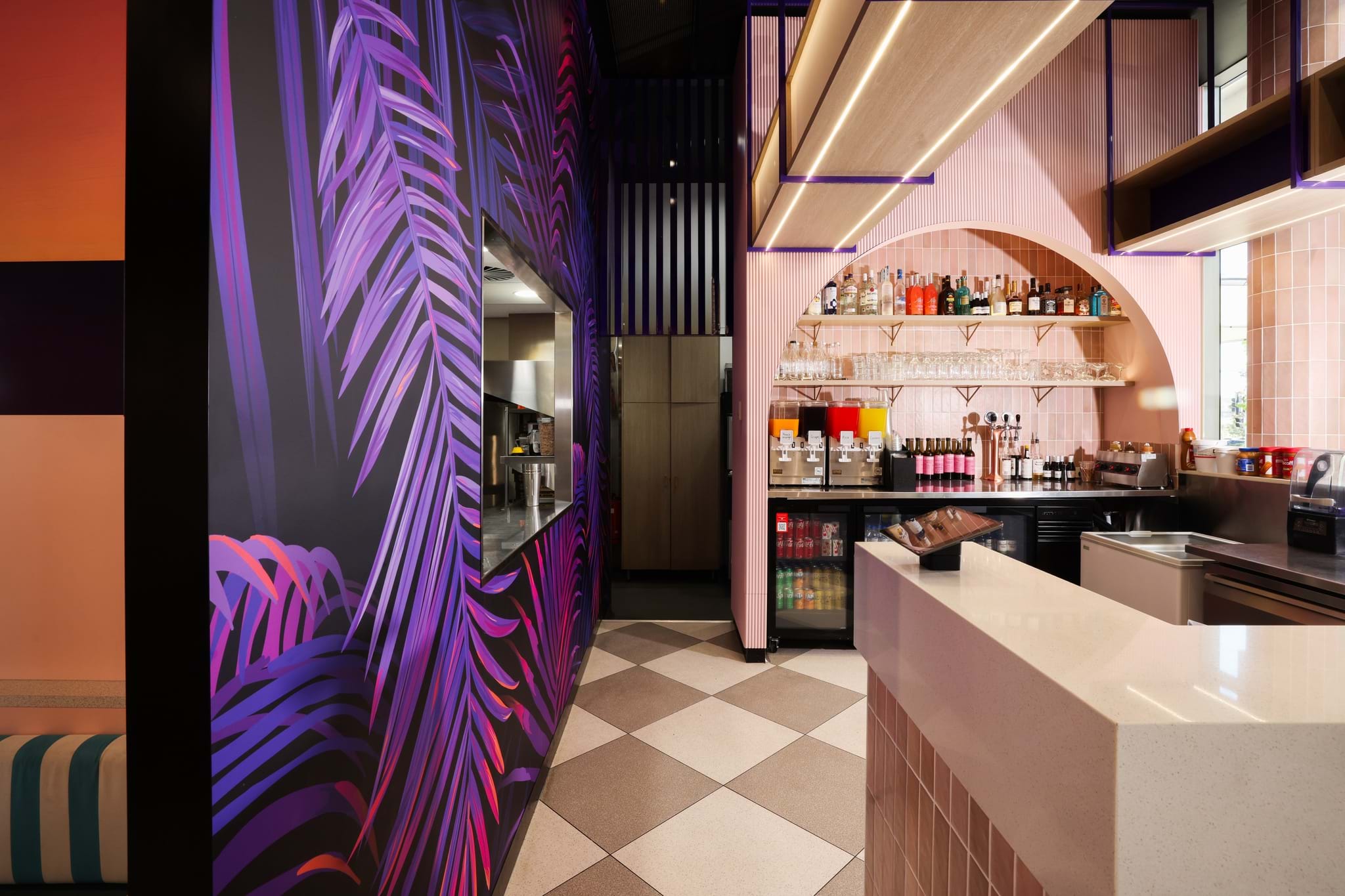 The outcome is a feature installation that commands attention in a bustling, high-traffic zone. It adds a layer of architectural character to the space, balancing Cali Burgers’ bold brand personality with the sophistication of considered design detailing.